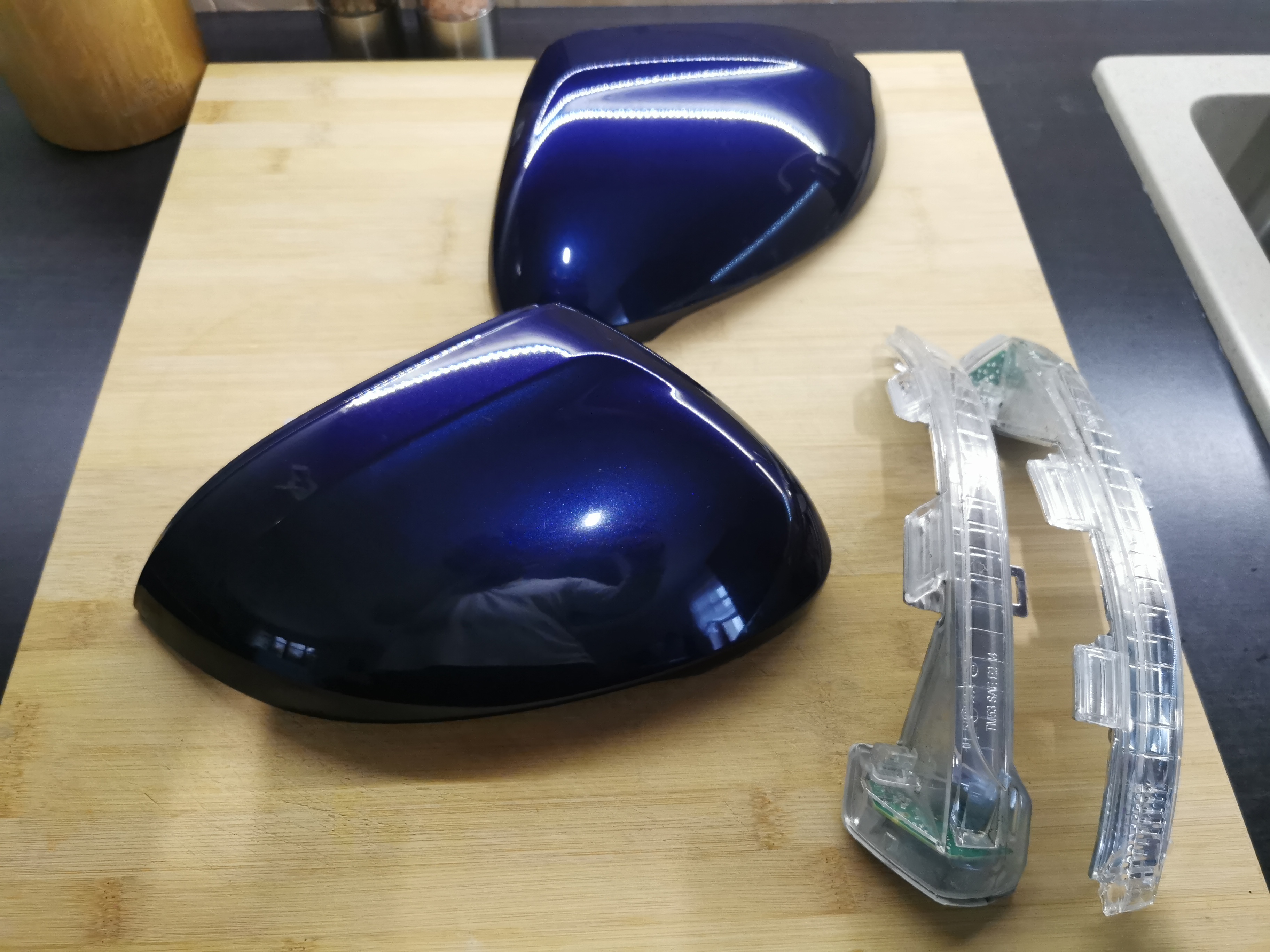 Mam na zbyciu lakierowane części obudowy lusterek bocznych. Kolor atlantic blue z otworem na side assist. Mankament jest taki, że kazda strona ma urwany jeden z klipów. Z tym lub osobno mam kierunki z lusterek.