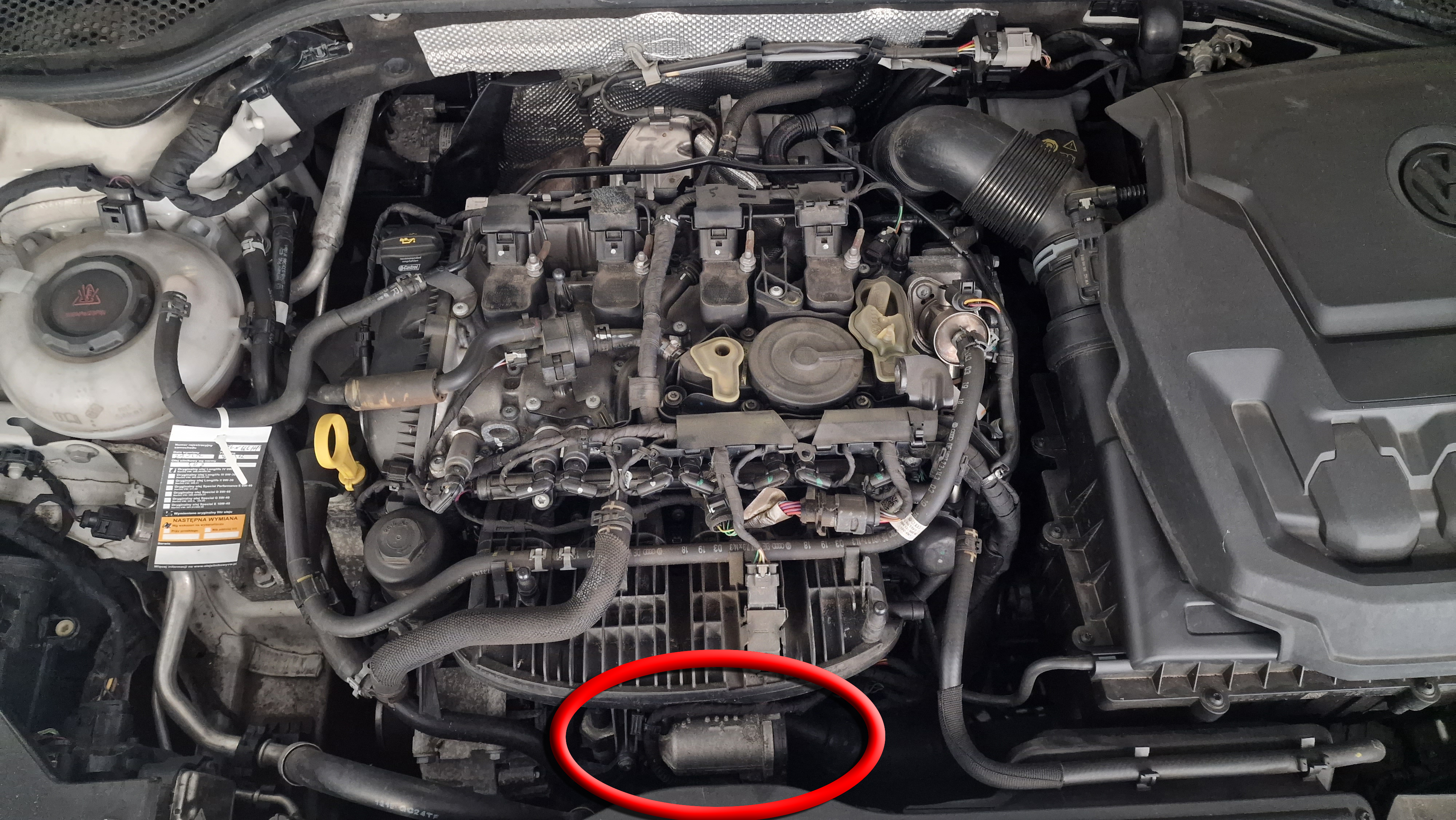 Przednia cześć silnika, nieco z dołu. Gruba rura idąca od filtra powietrza idzie na tył silnika, wchodzi do sprężarki, ze sprężarki idzie na intercooler, a z niego wchodzi do przepustnicy, która jest przykręcona do kolektora dolotowego. Trzeba poluzować obejmy, zdjąć rurę i zerknąć do przepustnicy oceniając stopień zasyfienia... Jeśli już będziesz to robił to kup sobie preparat do czyszczenia przepustnic. Jest pod ciśnieniem, ma rurkę, którą możesz skierować do przepustnicy i lać tak długo aż wszystko (kanał i listek przepustnicy) będzie metalicznie czyste.