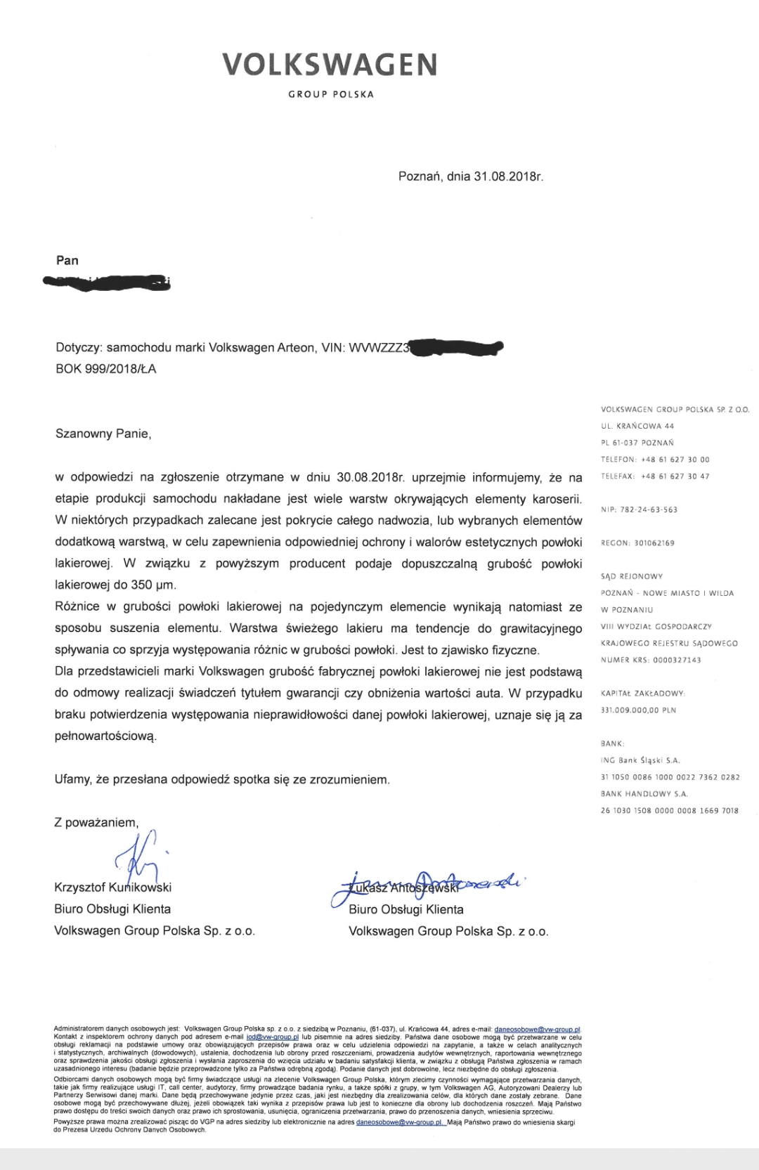 Składam reklamację na grubość, żeby mieć oficjalne pismo od vw, że to jest w granicach ich normy.