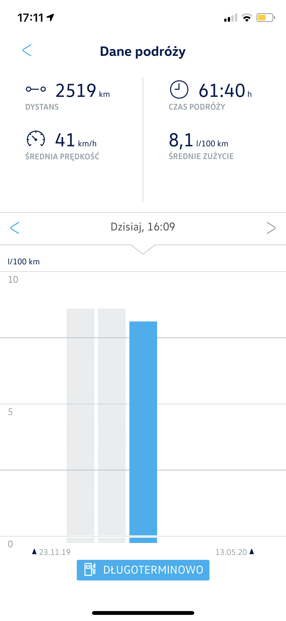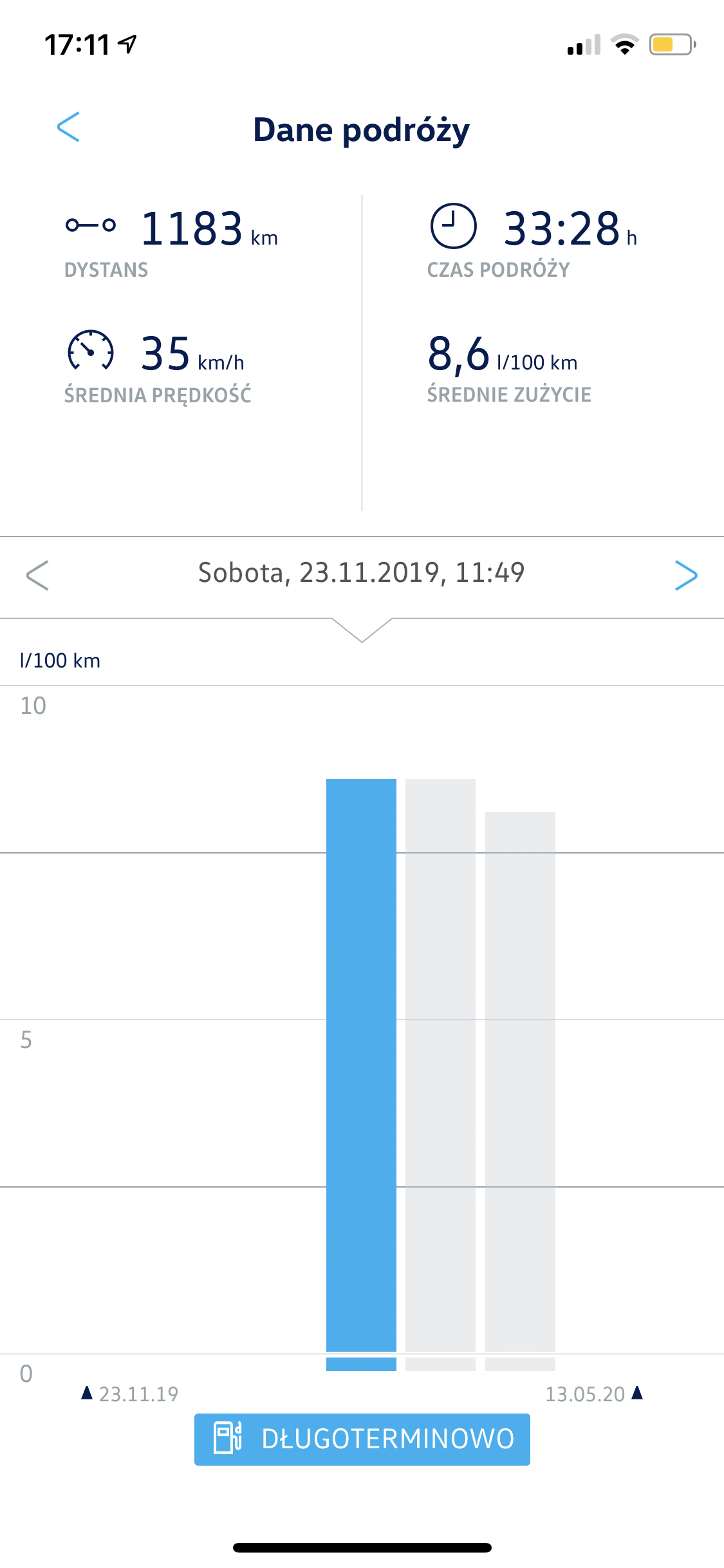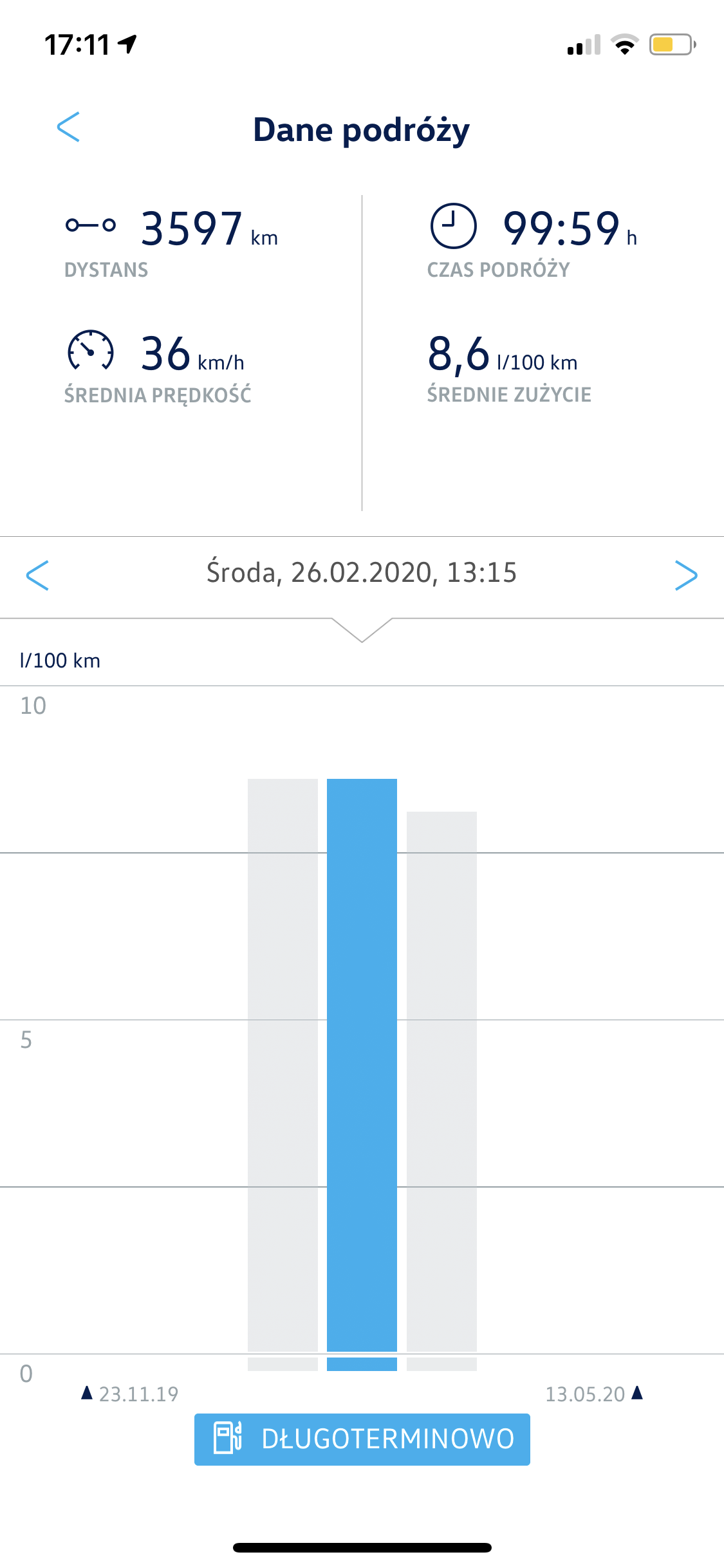 Na tę chwilę spalanie minimalne zdarzyło się na poziomie 5,1L/100km w płynnej podmiejskiej trasie 114km.
