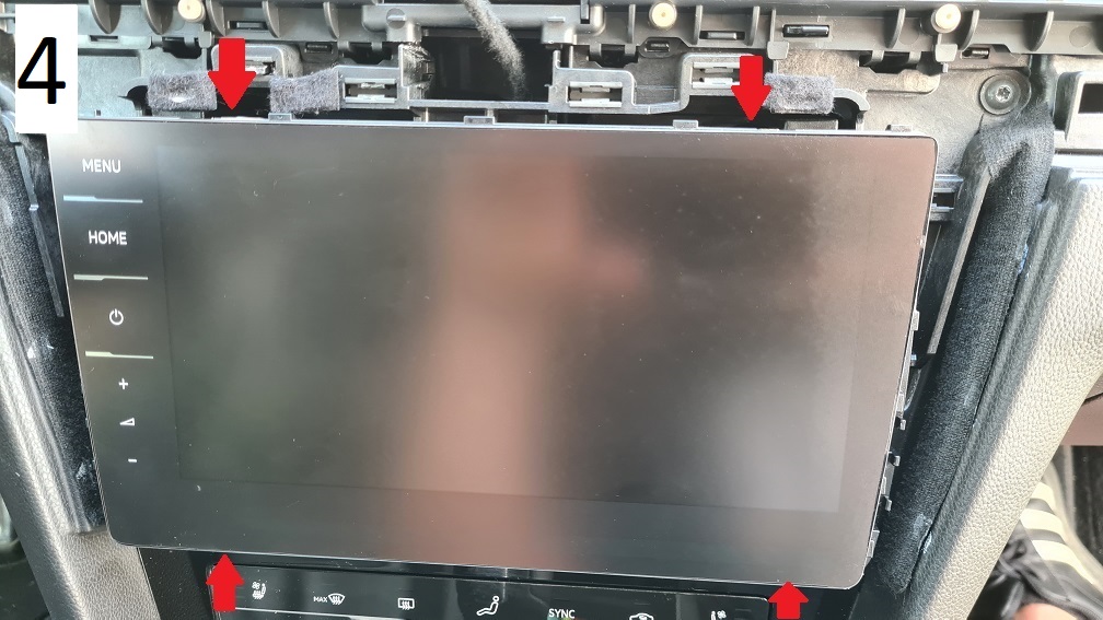 Następnie wyjmujemy ekran. Trzymają go cztery zawleczki, które trzeba po kolei odciągać jednocześnie lekko wyciągając moduł (miejsca zawleczek fot. 4.,wygląd zawleczki fot. 5). Sam ekran jest dosyć ciężki i na krótkich kablach. Nie chciałem go odpinać z uwagi na możliwe cyrki natury elektronicznej. Można śmiało go przekręcić i położyć na tunelu środkowym. Dobrze zabezpieczyć jego tył np. szmatką, bo blacha może porysować elementy wykończenia w tym panel klimatyzacji.