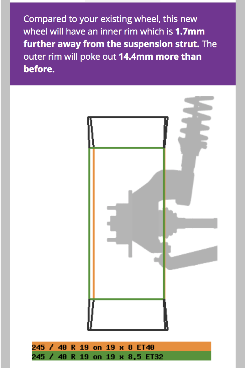 245/40/19... odsadzenie felg oryginalnych to ET40, te co Ty wybrałeś mają ET32 to znaczy, że po 8 mm wyjdą na zewnątrz w nadkolach