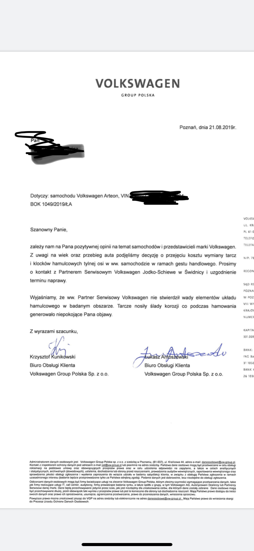A już miałem się umawiać na szukanie cesjobiorcy przez salon bo szczerze mówiąc miałem dość tłumaczenia, jeżdżenia, zostawiania auta na próby, testy itp. ale dudnienie przy hamowaniu doprowadzało mnie do szewskiej pasji. Zobaczymy jak będzie po wymianie. Tak przy okazji ile Wam powiedzieli za wymianę klocków i tarcz z tyłu/przodu na ich materiale? Mi za tył 2050 zł brutto, na moje "parsknięcie" zeszli do 1850 zł. W BMW F10 miałem 2350 zł brutto więc nie wiem czy ten VW jest taki dla ludu...