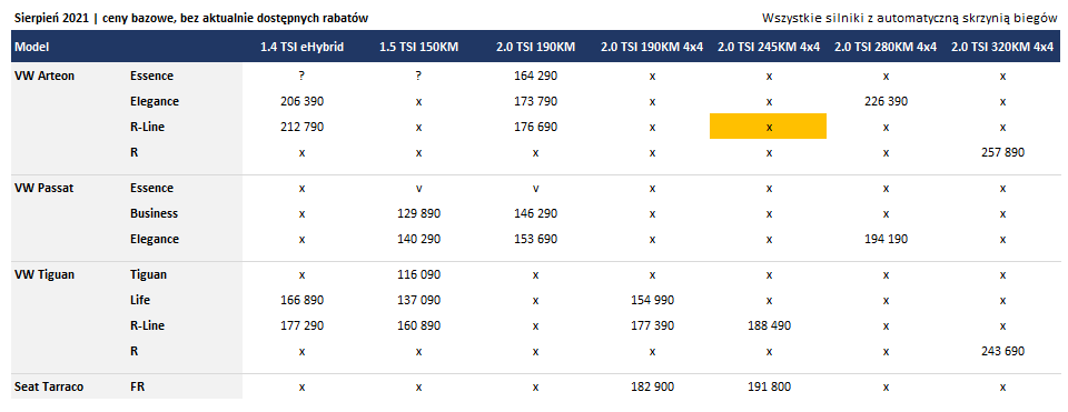 VW ma obecnie w swojej ofercie silnik, który w mojej ocenie idealnie pasowałby do tego auta, czyniąc je jedną z najlepszych ofert na rynku w tym segmencie. Jest to jednostka 2.0TSI 245KM 4x4, która występuje w innych modelach VW + Seat + Skoda. Ponadto, jak widać różnica cenowa, pomiędzy 190KM a 245KM to średnio ok 10tys zł.