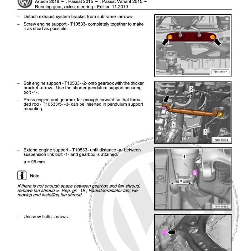 Wg serwisówki VW trzeba tylko odkręcić poduszkę skrzyni i odsunąć ją w stronę przodu samochodu. Poszedłem więc do garażu, by się za to zabrać i niestety serwisówka za dużo nie pomogła, gdyż zabrakło ok. 1cm, by wyjąć śrubę z przedniej tulei. Musiałem opuścić całe sanki, dopiero wtedy śruba wyszła. Przy okazji wymieniłem również tuleje przednie. Wyjęcie wahacza od strony pasażera, to już bajka