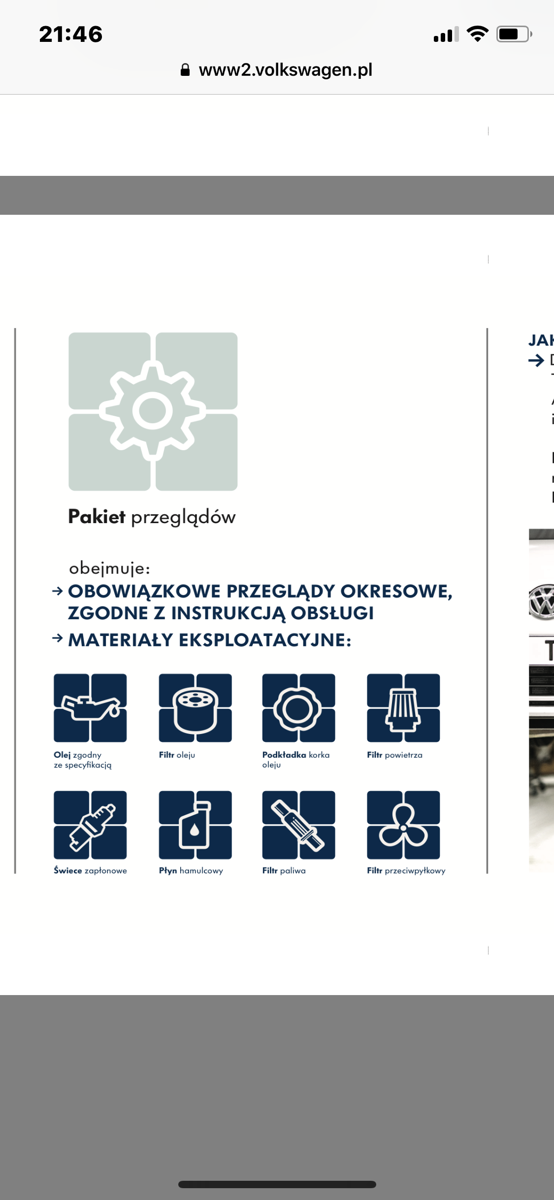 a. Obowiązkowe przeglądy okresowe samochodu w wydłużonym okresie wykonywane wg wskazań wskaźnika (QI4/QI6) wraz z materiałami eksploatacyjnymi wymienionymi w punkcie b, wykonywane we wszystkich Autoryzowanych Serwisach Volkswagena – zgodnie z instrukcją obsługi samochodu objętego Pakietem przeglądów, b. Materiały eksploatacyjne: olej zgodny ze specyfikacją Producenta (dotyczy również DSG/Haldex), filtr oleju, filtr przeciwpyłkowy, filtr paliwa, filtr powietrza, podkładka korka oleju, płyn hamulcowy, świece zapłonowe."