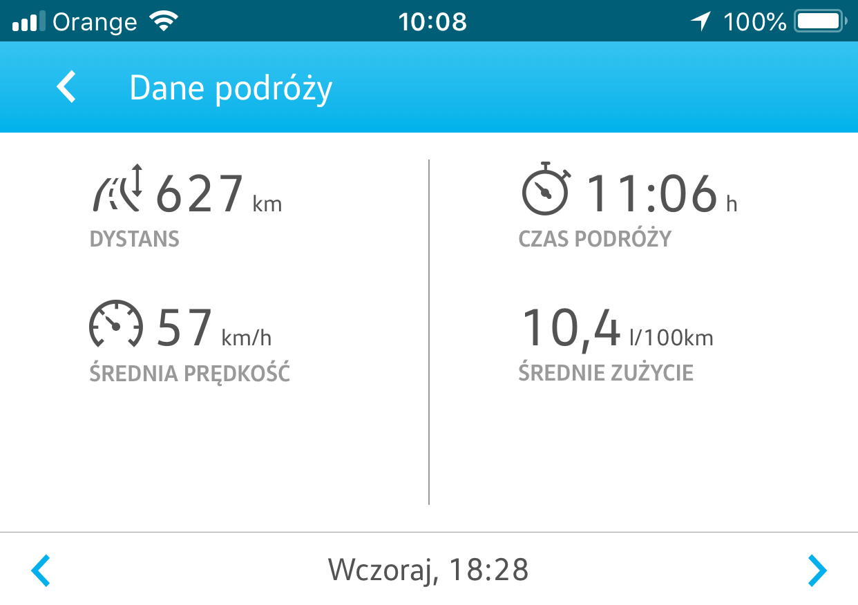 dystans / czas / srednia predkosc / srednie spalanie / warunki